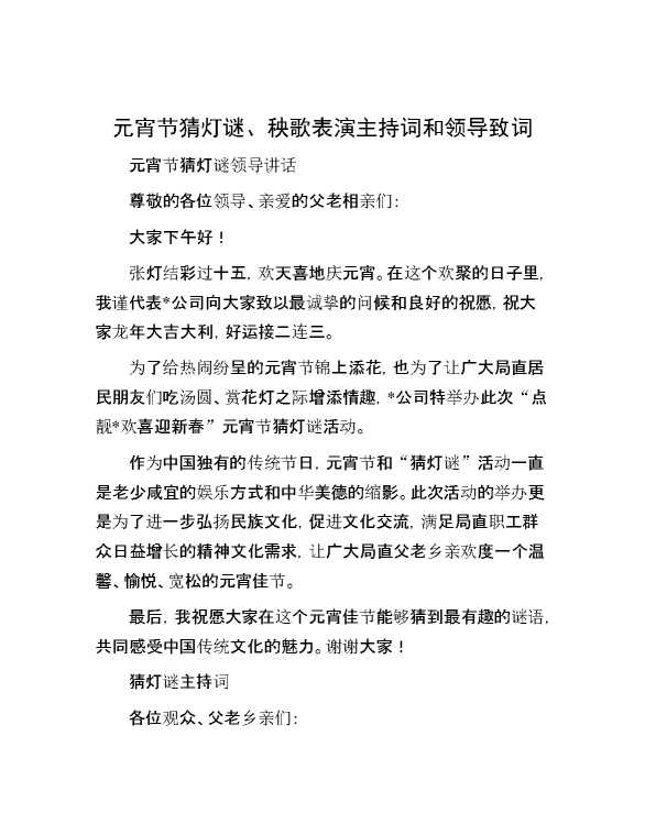元宵节猜灯谜、秧歌表演主持词和领导致词 2024-03-10 Word模板 99 购买前,请一定要先点击这里看看,欢迎持续关注,精彩模板每天推送 预览结束,本文件为word文档,一共5页,共1934字,请购买后,下载后查看 购买前,请一定要先点击这里看看,欢迎持续关注,精彩模板每天推送 资源下载下载价格29 RMBVIP免费升级VIP点击检测网盘有效后购买有任何充值和下载问题请加微信:xuexixuexi66 0 演讲发言