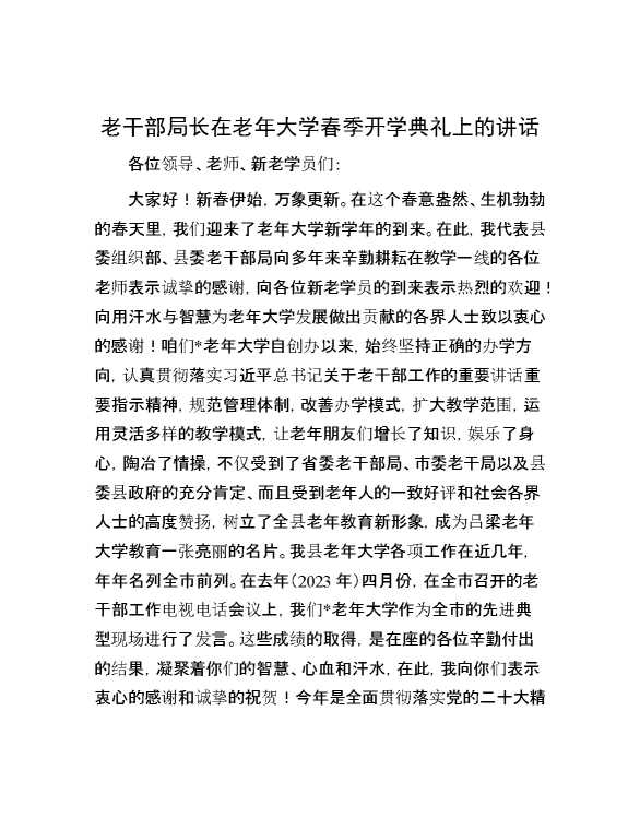 老干部局长在老年大学春季开学典礼上的讲话 2024-03-10 Word模板 110 购买前,请一定要先点击这里看看,欢迎持续关注,精彩模板每天推送 预览结束,本文件为word文档,一共3页,共1039字,请购买后,下载后查看 购买前,请一定要先点击这里看看,欢迎持续关注,精彩模板每天推送 资源下载下载价格29 RMBVIP免费升级VIP点击检测网盘有效后购买有任何充值和下载问题请加微信:xuexixuexi66 0 演讲发言