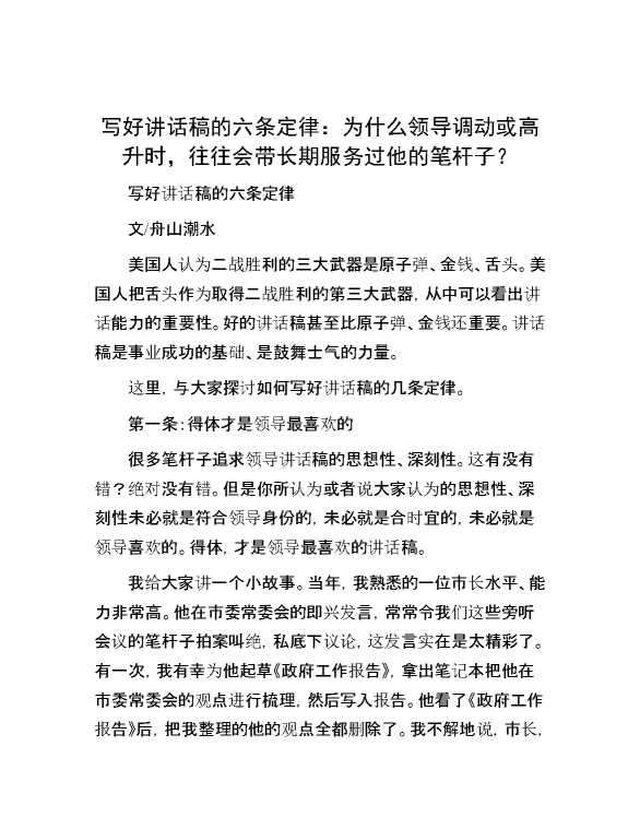 写好讲话稿的六条定律:为什么领导调动或高升时,往往会带长期服务过他的笔杆子? 2024-03-17 Word模板 104 购买前,请一定要先点击这里看看,欢迎持续关注,精彩模板每天推送 预览结束,本文件为word文档,一共11页,共4948字,请购买后,下载后查看 购买前,请一定要先点击这里看看,欢迎持续关注,精彩模板每天推送 资源下载下载价格29 RMBVIP免费升级VIP点击检测网盘有效后购买有任何充值和下载问题请加微信:xuexixuexi66 0 演讲发言