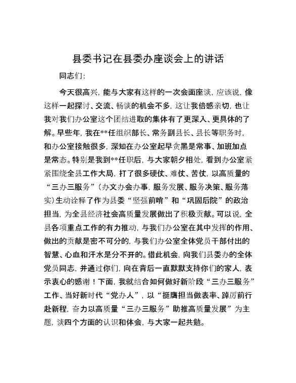 县委书记在县委办座谈会上的讲话 2024-03-17 Word模板 116 购买前,请一定要先点击这里看看,欢迎持续关注,精彩模板每天推送 预览结束,本文件为word文档,一共9页,共4274字,请购买后,下载后查看 购买前,请一定要先点击这里看看,欢迎持续关注,精彩模板每天推送 资源下载下载价格29 RMBVIP免费升级VIP点击检测网盘有效后购买有任何充值和下载问题请加微信:xuexixuexi66 0 演讲发言