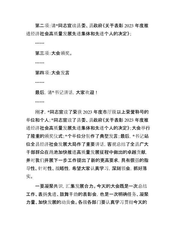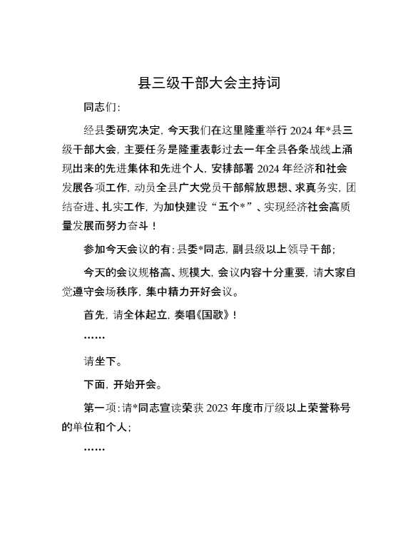县三级干部大会主持词 2024-03-17 Word模板 103 购买前,请一定要先点击这里看看,欢迎持续关注,精彩模板每天推送 预览结束,本文件为word文档,一共5页,共1908字,请购买后,下载后查看 购买前,请一定要先点击这里看看,欢迎持续关注,精彩模板每天推送 资源下载下载价格29 RMBVIP免费升级VIP点击检测网盘有效后购买有任何充值和下载问题请加微信:xuexixuexi66 0 演讲发言