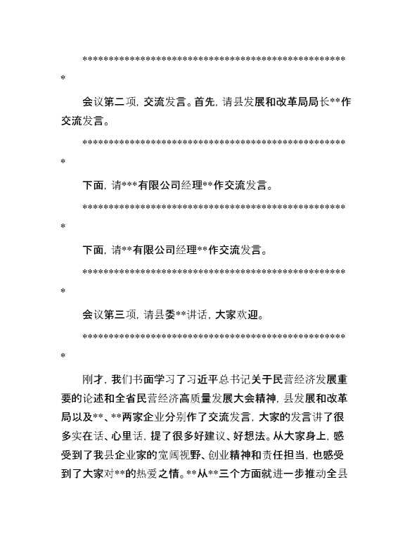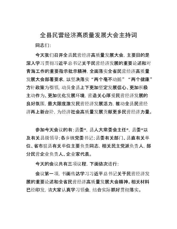 全县民营经济高质量发展大会主持词 2024-03-17 Word模板 112 购买前,请一定要先点击这里看看,欢迎持续关注,精彩模板每天推送 预览结束,本文件为word文档,一共5页,共1675字,请购买后,下载后查看 购买前,请一定要先点击这里看看,欢迎持续关注,精彩模板每天推送 资源下载下载价格29 RMBVIP免费升级VIP点击检测网盘有效后购买有任何充值和下载问题请加微信:xuexixuexi66 0 演讲发言
