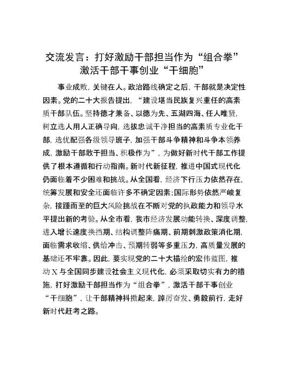 交流发言:打好激励干部担当作为“组合拳” 激活干部干事创业“干细胞” 2024-03-17 Word模板 106 购买前,请一定要先点击这里看看,欢迎持续关注,精彩模板每天推送 预览结束,本文件为word文档,一共6页,共2706字,请购买后,下载后查看 购买前,请一定要先点击这里看看,欢迎持续关注,精彩模板每天推送 资源下载下载价格29 RMBVIP免费升级VIP点击检测网盘有效后购买有任何充值和下载问题请加微信:xuexixuexi66 0 演讲发言